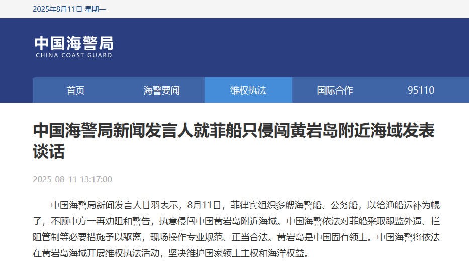 圖源:中國海警局官網 中國海警局新聞發言人甘羽表示,8月11日,菲律賓組織多艘海警船、公務船,以給漁船運補為幌子,不顧中方一再勸阻和警告,執意侵闖中國黃岩島附近海域。中國海警依法對菲船採取跟監外逼、攔阻管制等必要措施予以驅離,現場操作專業規範、正當合法。 甘羽強調,黃岩島是中國固有領土。中國海警將依法在黃岩島海域開展維權執法活動,堅決維護國家領土主權和海洋權益。(完) 【編輯:石歡歡】