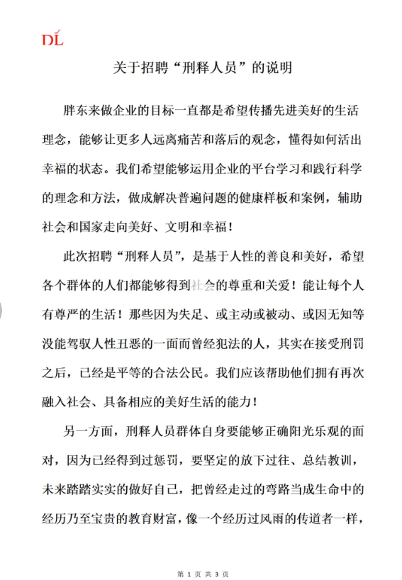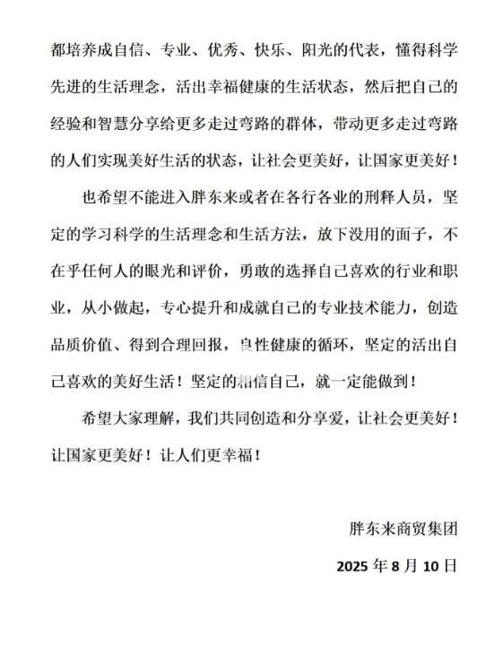 香港中通社8月11日電 近日,中國河南新鄉知名零售企業胖東來擬招聘刑釋人員的消息引發關注。對此,北京時間8月10日晚,胖東來創始人于東來在社交平台發布聲明稱,此舉源於“人性的善良與美好”,旨在推動社會對刑釋人員的尊重與關愛。