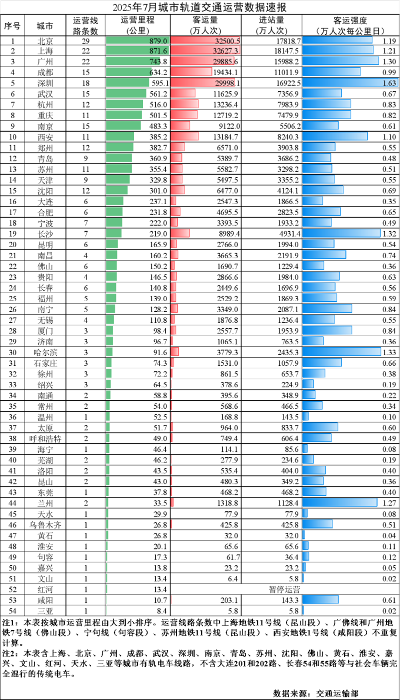 2025年7月城市軌道交通運營數據速報。圖源:交通運輸部 值得一提的是,在7月份,全國新增了19.9公里的運營里程,並且新增了一個運營區段——天津地鐵4號線北段。然而,也存在一定的調整,如廣州海珠有軌電車1號線從廣州塔站到廣州塔東站的區段核減了0.7公里的運營里程。(完) 【編輯:彭玉婷】