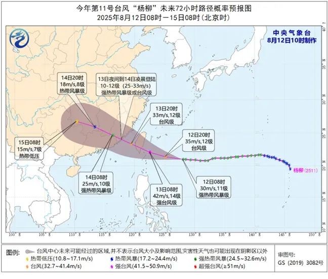 圖源:中央氣象台 “楊柳”將穿過台灣島後進入台灣海峽,強度逐漸減弱,並將於13日夜間至14日淩晨在福建南部到廣東東部一帶沿海再次登陸(強熱帶風暴級),登陸後強度緩慢減弱。 中央氣象台12日發布的颱風黃色預警顯示,預計12日14時至13日14時,台灣以東洋面、巴士海峽、台灣海峽、東海東南部及台灣島大部、福建東部沿海將有6至8級風、陣風9至10級,颱風中心經過的附近海域和地區風力有11至14級,陣風15至16級。台灣島東部和南部將有大到暴雨,其中台灣島東部的部分地區有大暴雨。
