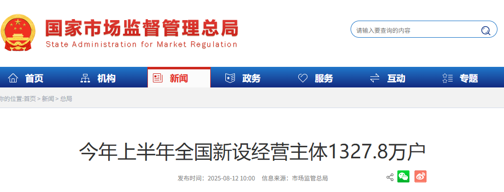 香港中通社8月12日電 8月12日,中國市場監管總局公布數據,今年上半年,中國新設經營主體1327.8萬戶。