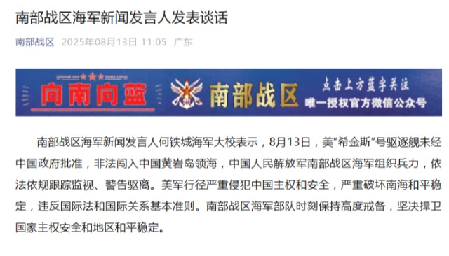 香港中通社8月13日電 中國人民解放軍南部戰區海軍新聞發言人何鐵城海軍大校13日表示,當日,美“希金斯”號驅逐艦未經中國政府批准,非法闖入中國黃岩島領海,中國人民解放軍南部戰區海軍組織兵力,依法依規跟蹤監視、警告驅離。