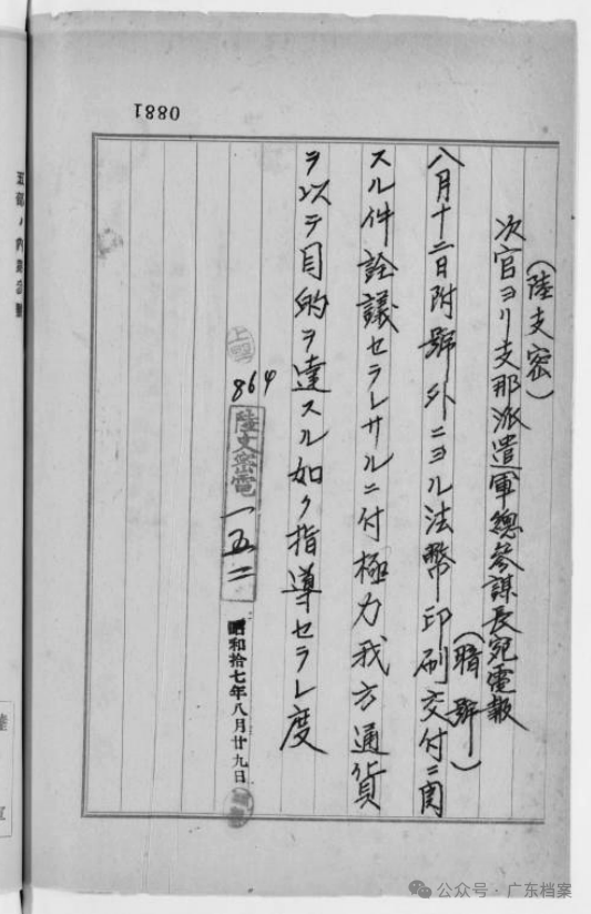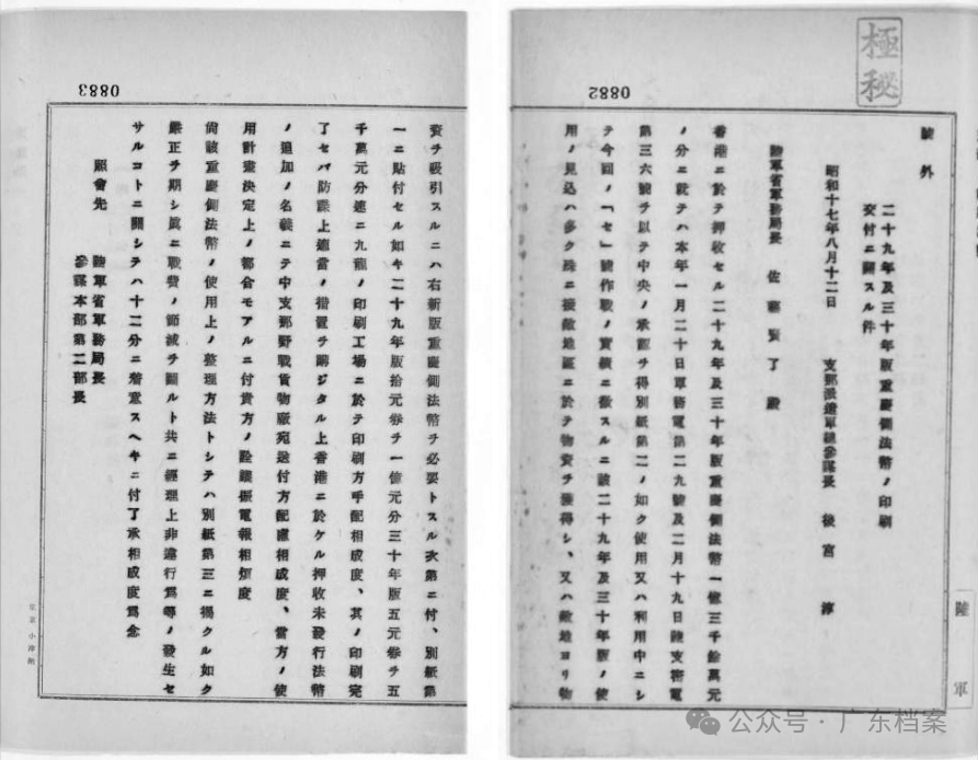 鐵證如山!侵華日軍在港開展“偽鈔戰”檔案史料全文公布香港新聞網8月14日電 今年是中國人民抗日戰爭暨世界反法西斯戰爭勝利80周年。8月14日,廣東省檔案館全文公布一批侵華日軍在中國香港侵佔和偽造中國法幣有關日文文件電報檔案。 據了解,這批日文檔案史料是日本學者鬆野誠也在今年3月25日向廣東省檔案館捐贈的。隨後,廣東省檔案館組織專家對其進行了鑒定和全文翻譯。 其中主要的三份文件如下: 一是侵華日軍中國派遣軍1942年8月12日向日本陸軍省呈報的《關於印製和交付二十九年及三十年版重慶方面法幣的請示》。