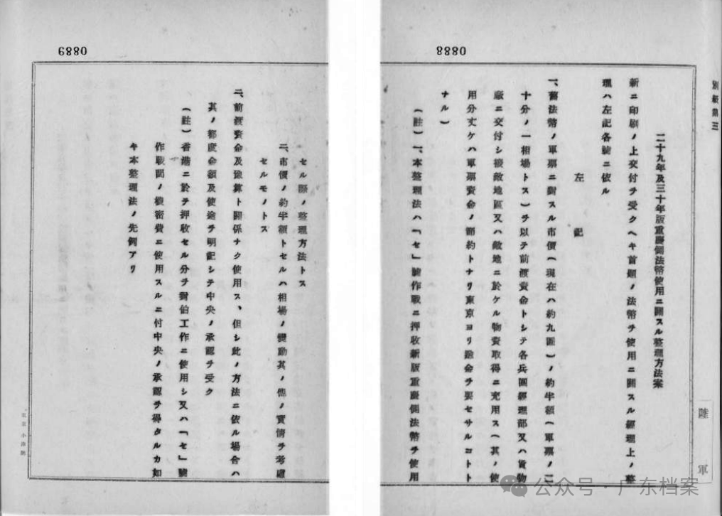 (圖源:“廣東檔案”微信公眾號,下同) 中譯:我們在香港沒收了二十九年和三十年版重慶方面的法幣一億三千餘萬元,向中央申請使用這些法幣,今年收到了日期為1月20日的軍務電第29號,日期為2月19日的陸支密電第36號,獲得了同意。如第2號附件所示,這些二十九年和三十年版紙幣用在了此次“塞號作戰”之中,取得了一定成效。可見,這些新版重慶方面的法幣可以用在很多地方,特別是可以用於從毗鄰敵人控制區的地區獲取物資,或者從敵人控制區獲取物資。希望迅速調派印刷工人,在九龍的印刷工廠印製二十九年版十元券一億元、三十年版五元券五千萬元,兩種貨幣的樣品已經貼在附件第12號上。印製好之後要注意採取適當措施進行防諜,然後宣稱這些是在香港扣押的未發行的法幣,並以將這些法幣追加投放到市場的名義,將其發送給中支那野戰貨物廠。煩請你方審議我方的使用計劃,並以電報形式回覆結果。 附件第三號是關於使用重慶方面法幣時需要遵守的規則和注意事項。需要充分注意,努力達到節省戰爭經費的目的,同時防止違法違規使用法幣情況的發生。 二是侵華日軍中國派遣軍1942年侵佔香港後制定的《關於二十九年及三十年版重慶方面法幣的使用規則》。