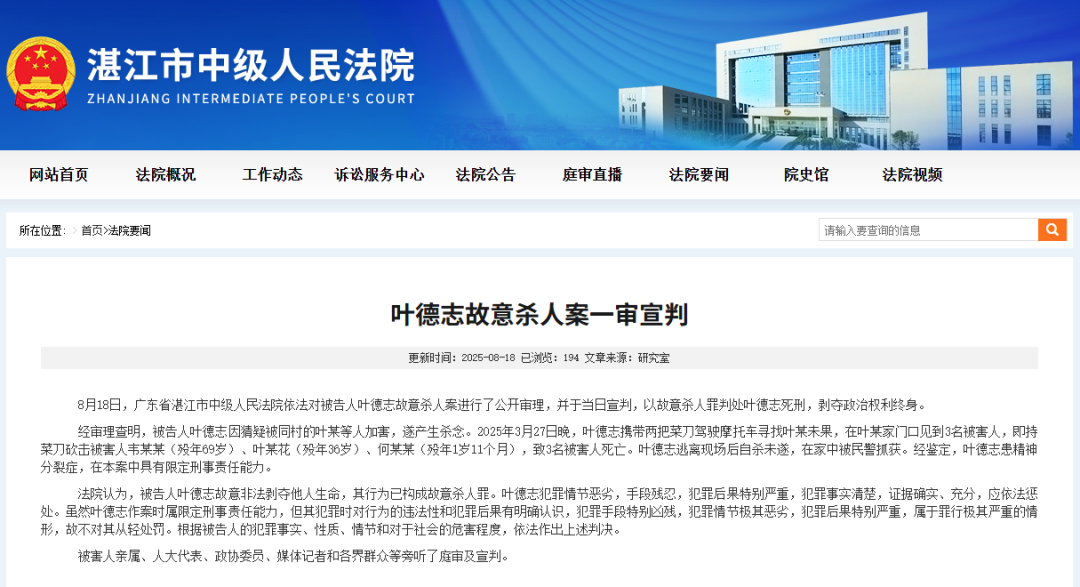 湛江市中級人民法院網站截圖 今年3月27日,廣東廉江東湧村發生一起刑事案件。被害人家屬何先生發文稱,村民葉某志傍晚潛入鄰居家中,將祖孫三人殘忍殺害。死者是何先生的妻子、岳母和不到兩歲的兒子。 經審理查明,被告人葉某志因猜疑被同村的葉某等人加害,遂產生殺念。3月27日晚,葉某志攜帶兩把菜刀駕駛摩托車尋找葉某未果,在葉某家門口見到3名被害人,即持菜刀砍擊被害人韋某某(歿年69歲)、葉某花(歿年36歲)、何某某(歿年1歲11個月),致3名被害人死亡。葉某志逃離現場後自殺未遂,在家中被民警抓獲。經鑒定,葉某志患精神分裂症,在本案中具有限定刑事責任能力。4月27日,該案移送廉江市人民檢察院審查。 法院認為,被告人葉某志故意非法剝奪他人生命,其行為已構成故意殺人罪。 雖然葉某志作案時屬限定刑事責任能力,但其犯罪時對行為的違法性和犯罪後果有明確認識,屬於罪行極其嚴重的情形,故不對其從輕處罰,依法作出上述判決。(完) 【編輯:彭玉婷】
