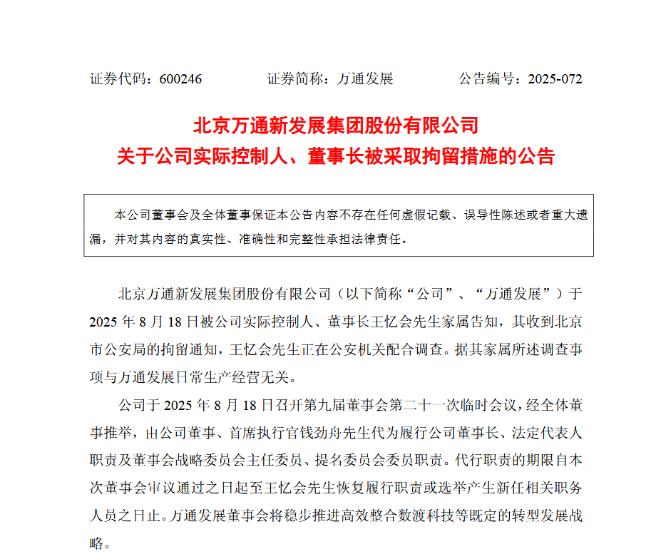 北京萬通新發展集團股份有限公司(萬通發展)公告 公告顯示,萬通發展當天被王憶會家屬告知,其收到北京市公安局的拘留通知,王憶會正在公安機關配合調查。據其家屬所述調查事項與萬通發展日常生產經營無關。 萬通發展表示,該公司於8月18日召開第九屆董事會第二十一次臨時會議,由公司董事、首席執行官錢勁舟代為履行公司董事長、法定代表人職責及董事會戰略委員會主任委員、提名委員會委員職責。代行職責的期限自本次董事會審議通過之日起至王憶會恢復履行職責或選舉產生新任相關職務人員之日止。 公開資料顯示,萬通發展原名萬通地產,成立於1998年,主營房地產開發與銷售、城市更新與運營、通信與數字科技等業務。 截至8月18日收盤,萬通發展在中國A股觸及跌停,報收每股9.58元人民幣。(完) 【編輯:彭玉婷】