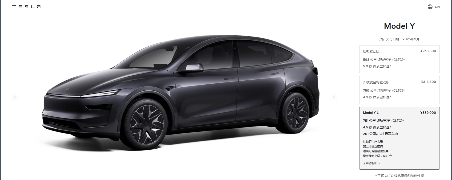 圖源:特斯拉中國官網截圖 據網站消息,特斯拉Model Y L車身加長179mm,軸距增至3040mm,儲物空間達2539升,採用六座布局。前排座椅新增頭枕腿托,二排獨立座椅多向電動調節,三排配i-Size安全座椅接口。全車安全氣囊覆蓋95%縱向空間,座椅具備加熱通風功能。雙電機驅動,百公里加速4.5秒,續航751公里。提供首付9.99萬起3年0息等福利,總值約3萬。 在中國內地,六座純電SUV市場競爭劇烈。蔚來樂道L90於7月31日上市,六座版售價26.58萬元起,七座版27.18萬元起,上市10天交付超4000台。理想i8於7月29日發布,定價33.98萬元,小訂用戶超3萬,將於8月20日交付。 分析指,特斯拉Model Y L以高端定位和長續航優勢,預計將進一步推動市場競爭。特斯拉上周剛上線Model 3後輪驅動長續航版,售價26.95萬元。叠加Model Y L的上市不僅豐富了特斯拉的產品線,也為消費者提供了更多純電SUV選擇。(完) 【編輯:彭玉婷】