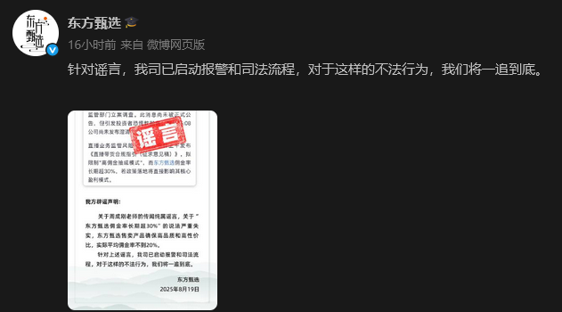 圖源:東方甄選微博賬號截圖 東方甄選當天傍晚發表闢謠聲明稱,關於周成剛的傳聞純屬謠言,關於“東方甄選傭金率長期超30%”的說法嚴重失實,東方甄選售賣產品確保高品質和高性價比,實際平均傭金率不到20%。 東方甄選還表示,針對上述謠言,已啟動報警和司法流程,將一追到底。 當天稍早,東方甄選港股報收34.32港元,跌20.89%,此前一度上探至近兩年高位53.7港元,漲幅超23.5%。 東方甄選由新東方於2021年推出,最初作為直播電商平台運營,後依賴董宇輝等明星帶貨效應擴大了知名度。隨著東方甄選戰略逐步轉向“去頭部化”,其與董宇輝的關係也逐漸疏遠。2024年7月,董宇輝宣佈自營運營。目前,東方甄選正大力發展自營產品,試圖打造線上會員制零售模式。(完) 【編輯:彭玉婷】