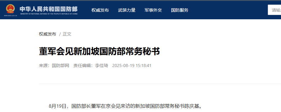 香港中通社8月19日電 中國國防部長董軍19日在北京會見來訪的新加坡國防部常務秘書陳慶基,雙方均表示要增進中新防務等領域合作。