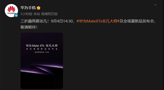 圖源:“華為手機”微博賬號截圖 綜合報道,華為指出,9月4日舉辦“華為Mate XTs非凡大師及全場景新品發布會”,推出首款三折叠屏手機,引發行業廣泛關注。 據悉,華為Mate XTs這一創新設計被認為是華為在折叠屏技術領域的又一突破,旨在鞏固其在高端智能手機市場的領先地位。數據顯示,今年第二季度,華為在中國智能手機市場的出貨量占比達到18.1%,位居市場第一,展現了其強大的本土競爭力。