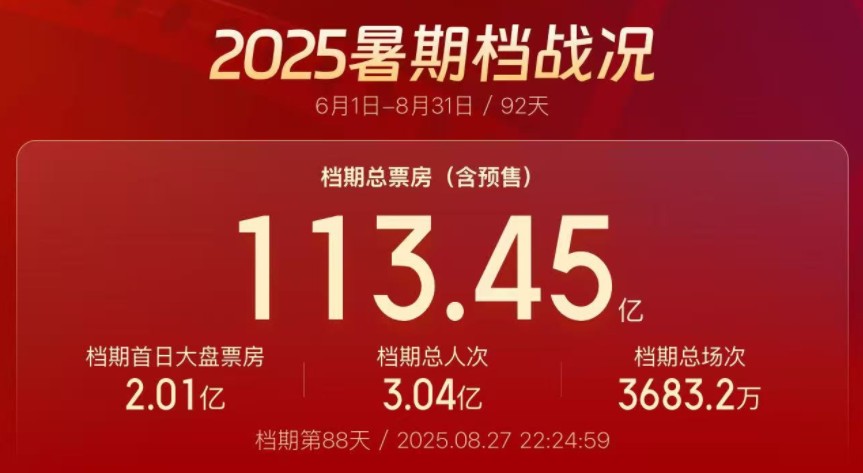 香港新聞網8月28日電 2025年暑假接入尾聲,據網絡平台數據,截至8月27日22時24分,中國2025年暑期檔電影總票房達113.45億,超2024年暑期檔同期水平。 截至26日17時,2025年暑期檔觀影人次(含預售)破3億,超2024年暑期檔觀影人次成績。