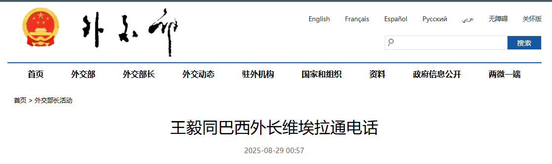 中國外交部官網截圖 據中國外交部官網29日消息,王毅表示,中巴關係進入歷史最好時期。兩國元首建立了牢固互信與友誼,共同為中巴命運共同體建設提供重要戰略指引。中方願同巴方加強戰略互信,堅定相互支持,加緊落實兩國元首重要共識,深化中巴各領域務實合作。 維埃拉表示,當前,國際貿易面臨很大不確定性,多邊主義遭遇嚴重挑戰,金磚國家開展密切協調具有重要意義。巴方期待同中方及有關各方加強溝通協調,探討支持多邊貿易體系,推動世貿組織改革。