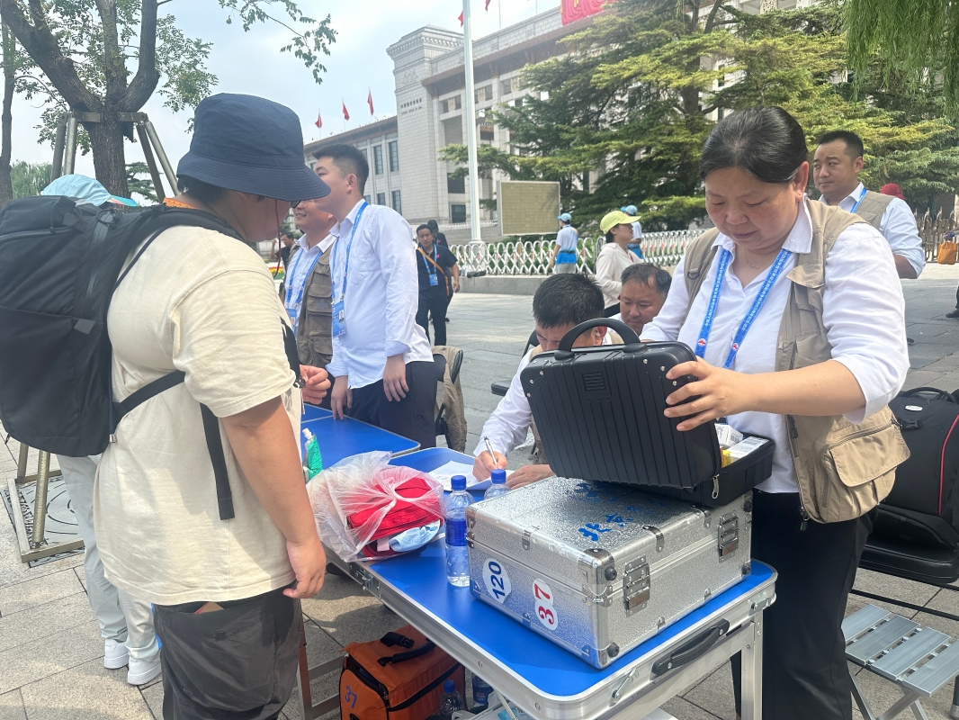 (香港中通社記者 陳卓儀攝) 北京當天最高溫達32攝氏度,閱兵活動結束後沿路還設置了醫療站,提供解暑的藥物,附近也有志願者派發電解質飲料和瓶裝水,讓回程的觀眾能降溫解暑。(完) 【編輯:譚暢】