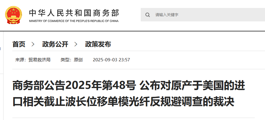 中國商務部官網截圖 中國商務部提到,上述反規避措施實施期限到2028年4月21日。 中國商務部新聞發言人本月4日介紹,今年3月4日,應中國國內企業申請,中國商務部對原產於美國的進口相關截止波長位移單模光纖產品發起反規避調查。該案是中國首起反規避調查。 據介紹,立案後,中國商務部依法依規開展了調查,調查程序公開透明,充分保障了各利害關係方的權利。經過調查,證據顯示,美國出口商通過對華出口相關截止波長位移單模光纖,規避了中國對美非色散位移單模光纖產品的反傾銷措施。根據調查結果,中國商務部發布公告,決定自9月4日起實施反規避措施。(完) 【編輯:彭玉婷】