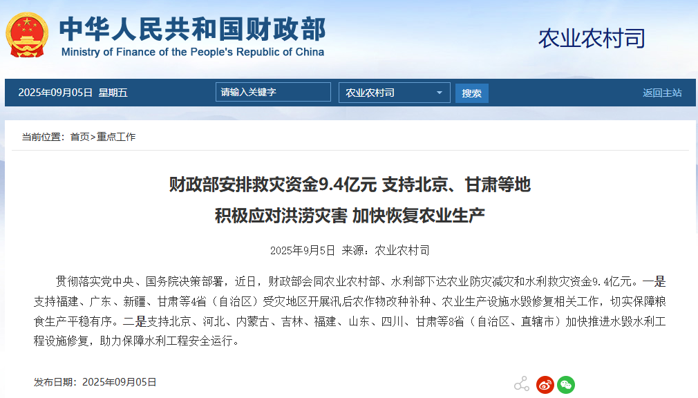 中國財政部官網截圖 據介紹,這批救災資金一是支持福建、廣東、新疆、甘肅等4省(自治區)受災地區開展汛後農作物改種補種、農業生產設施水毀修復相關工作,切實保障糧食生產平穩有序;二是支持北京、河北、內蒙古、吉林、福建、山東、四川、甘肅等8省(自治區、直轄市)加快推進水毀水利工程設施修復,助力保障水利工程安全運行。 中國水利部有關負責人上月介紹,今年“七下八上”(7月下旬到8月上旬)防汛關鍵期,中國主要江河共發生2次編號洪水,但有330條河流發生超警以上洪水,其中77條河流超過保證水位,22條河流發生有實測資料以來最大洪水。雨情水情汛情總體呈現降雨點強面弱、極端性強,颱風登陸頻繁、影響面廣,洪水散發并發、漲勢迅猛,汛情區域分化、北方偏重等特點。(完) 【編輯:彭玉婷】