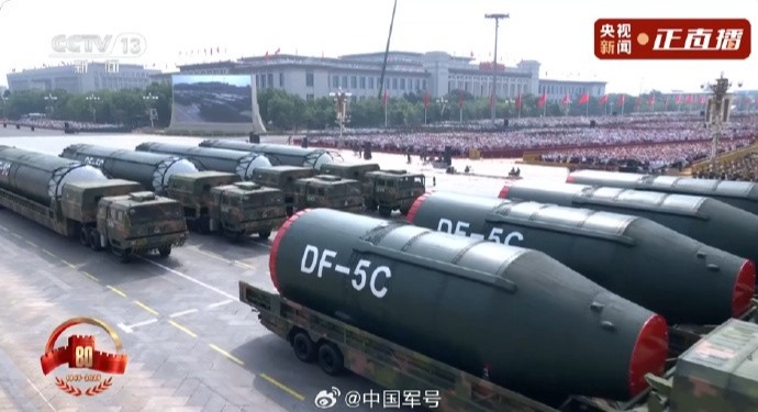 香港中通社圖片 事實上,從空中無人機作戰方隊到整個無人作戰體系,這些概念提出來其實並沒有幾年時間,中國就已經做出了一些嘗試。 這些動作背後展現出的能力,更加可貴。 突破三:“ 航母戰鬥力的躍升 ” 這次閱兵,航母無法參閱,但這並不意味著,閱兵和航母沒關係。 閱兵中,殲-15DH、殲-15DT、殲-35和殲-15T四型戰機組成艦載機梯隊,接受檢閱。 DHT三個字母,“D”是電子戰,“H”是“滑躍型”,“T”是“彈射型”。 我國三艘航母,遼寧艦和山東艦都是滑躍起飛,福建艦是電磁彈射起飛。而“T”,既可以上福建艦,也可以上遼寧艦和山東艦。 這幾款戰機的基本款殲-15,是我國自行設計研製的首型艦載多用途戰鬥機。據殲-15總設計師孫聰講,當時,大家對於艦載機懂得不是很多,覺得就是在飛機上加個尾鉤就好。 因此,殲-15更像是一次嘗試,它在各個方面,都有較大升級空間。 航母的一大作戰任務,就是在局部海域奪取制空權,因此,相較於基礎款,改進型都更加強調其“進攻”的屬性。 借助電磁彈射,殲-15T能以最大起飛重量起飛,載彈量增加,其火力打擊能力大大增強。 殲-15DH安裝了專用電子戰吊艙,具備強大的電子戰能力,可以為機群出擊提供伴隨幹擾或遠距離電子攻擊。 除了殲-15系列,在閱兵中出現的空警-600預警機,也會上艦。空警-600支持彈射起飛,這也意味著,它適合福建艦。 固定翼預警機能夠為航母戰鬥群提供更長的預警時間,大大提高攔截效率。 這些機型在閱兵式的出現,都意味著航母作戰能力會實現新的突破。 突破四:“ 三位一體核威懾能力再升級 ” 和2019年閱兵不同,這次的核導彈群並沒有按照型號來劃分方隊,而是直接以“第一方隊”“第二方隊”接受檢閱。 其中,核導彈第一方隊包括: ||“驚雷-1”空基遠程導彈 ||“巨浪-3”潛射洲際導彈 ||“東風-61”陸基洲際導彈 ||“東風-31”新型陸基洲際導彈 這是我國首次集中展示陸、海、空基“三位一體”戰略核力量。這次亮相,有兩個重要意義。 一是,它補足了我們之前在空基上的短板。 “三位一體”中,陸基和海基的戰略威懾,是“開弓沒有回頭箭”的,發射出去撤回不了。 而空基,正好是對陸基和海基的補充。首先,空基更為靈活,飛機直接升空,對其打擊難度就加大。而對於威懾效力來說,飛機起飛與到達指定地點,這中間是有時間間隔的,這個時間段,就是威懾“具象化”的體現——留給你的時間不多了,你要不要抓緊改改主意。 在這之前,由於遠程戰略轟炸機性能的原因,我們在空基上是有短板的——轟-6的作戰半徑還不夠遠、本身突防能力也不夠強,這也是大家為什麽那麽期待轟-20的原因。 但現在,“驚雷”的出現補上了這塊短板。飛機的作戰半徑+加油機+“驚雷”,這個距離,足以讓威懾範圍進一步擴大。至此,“三位一體”才圓滿。 二是,海基生存能力的極大提升。2019年閱兵,“巨浪-2”出場,是叫“潛射遠程彈道導彈”,而“巨浪-3”,是叫“潛射洲際導彈”。 “遠程”變“洲際”,意味著“巨浪-3”的射程至少在8000公里以上。射程的增加帶來一個好處——我們的核潛艇不需要前出太多距離,就可以對目標產生戰略威懾作用,這也增強了我們核潛艇的生存能力。 震懾能力的增強,才符合解說詞裡提到的那句: (它們)是維護國家主權、捍衛民族尊嚴的戰略“王牌”。 在閱兵中,有這樣一句話: 80年後的今天,世界變亂交織,叢林法則抬頭、戰火硝煙頻仍,人類再次走到歷史的十字路口,何去何從?世界的目光投向東方,投向和平發展的中國! 我們用這場閱兵告訴了世界,我們有維護國家主權、捍衛民族尊嚴、維護世界和平的能力。 【編輯:李濼】