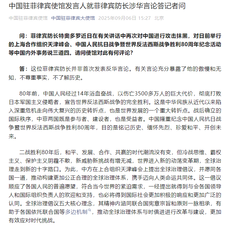 (圖源:“中國駐菲律賓使館”微信公眾號) 有記者問:菲律賓防長特奧多羅近日在有關講話中再次對中國進行攻擊抹黑,對日前舉行的上海合作組織天津峰會、中國人民抗日戰爭暨世界反法西斯戰爭勝利80周年紀念活動等中國內外事務說三道四。請問使館對此有何評論? 發言人說,這位菲律賓防長並非首次發表反華言論。有關言論充分暴露了他的傲慢和無知,不尊重事實,不了解歷史。 發言人說,80年前,中國人民經過14年浴血奮戰,以傷亡3500多萬人的巨大代價,徹底打敗日本軍國主義侵略者,宣告世界反法西斯戰爭的完全勝利。這是中華民族從近代以來陷入深重危機走向偉大復興的歷史轉折點,也是世界發展的一個重大轉折點。戰後確立的國際秩序,中菲兩國既是參與者、建設者,也是受益者。中國隆重紀念中國人民抗日戰爭暨世界反法西斯戰爭勝利80周年,目的是銘記歷史、緬懷先烈、珍愛和平、開創未來。 發言人表示,二戰勝利80年後,和平、發展、合作、共贏的時代潮流沒有變,但冷戰思維、霸權主義、保護主義陰霾不散,新威脅新挑戰有增無減,世界進入新的動蕩變革期,全球治理走到新的十字路口。為此,中方在上合組織天津峰會上提出全球治理倡議,並願同各國一道,推動構建更加公正合理的全球治理體系,攜手邁向人類命運共同體。這一倡議順應了各國人民的普遍願望,符合當今世界的緊迫需求,一經提出就得到與會各國領導人和國際組織負責人的歡迎和支持,也必將得到國際社會更加積極的響應和更加廣泛的認同。全球治理倡議五大核心理念,其精神內涵同聯合國憲章宗旨和原則一脈相承,有助於各國依托聯合國等多邊機制,推動全球治理體系與時俱進進行改革與建設,更加有效應對時代挑戰。 發言人指出,本次上合組織天津峰會和抗戰勝利紀念活動分別有20多位外國國家元首和政府首腦出席,其中約有10位來自東南亞鄰國。與會外國領導人一致高度評價兩場盛會,並讚賞中國為維護世界和平、推動多邊合作所作出的不懈努力。 發言人說,我們希望這位菲防長能睜眼看世界,走出冷戰思維,不要成為中菲關係信任赤字的源頭。(完) 【編輯:石歡歡】
