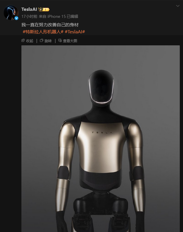 圖源:“TeslaAI”微博賬號截圖 照片中的機器人採用淺金與黑色相結合的流線型機身設計,顯著位置印有特斯拉標誌性Logo。中文配文寫道:“我一直在努力改善自己的身材。” 此後,特斯拉官方微博賬號轉發該博文,配文:“加速進化中。” “TeslaAI”賬號簡介稱,該賬號主要用於介紹“特斯拉人形機器人、智能輔助駕駛、Robotaxi無人駕駛網約車、Cortex計算集群”等AI產品。 9月2日,特斯拉曾在其官方X賬號上發布“宏圖計劃第四篇章”(Master Plan Part IV)。在該計劃封面上,Optimus機器人正在打開汽車的後備箱,似預示著特斯拉未來發展規劃的重大戰略轉向:即從電動汽車和能源全面轉向人工智能和機器人領域。(完) 【編輯:彭玉婷】