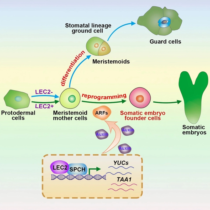模式圖展示氣孔前體細胞的兩條發育路徑。圖源:山東農業大學 早在1902年,“植物細胞全能性”概念被提出,即植物細胞可脫分化形成類似受精卵的全能幹細胞,進而發育為完整植株,但其背後的分子機制始終是科學界百年來的未解之謎。 較動物細胞而言,植物細胞具有更強的發育可塑性,在一定條件下,它們無需受精就能發育成胚胎,這種現象被稱為“體細胞胚胎發生”。植物細胞還有著獨特的“再生”能力,任意一種植物的體細胞在經歷重編程後能够回到原始的幹細胞狀態,並進一步進入“體細胞胚胎發生”階段,最終再生為一株完整的植株。 為揭開謎團,2005年起,論文通訊作者、山東農業大學張憲省教授率領的科研團隊以擬南芥為研究對象開啟探索。20年來,團隊先後構建了單個體細胞直接發育成胚胎的實驗技術體系,以及誘導單細胞起源的體細胞胚胎發生的穩定體系,並首次發現細胞全能性激活的“開關”是大量生長素的積累。 山東農業大學張憲省和蘇英華教授研究團隊利用先進的單細胞測序、活體成像等前沿技術,首次捕捉到單個植物細胞的分裂全過程,直觀證實了植物細胞全能性的“單細胞起源”,回答了學術界長期存在的疑惑。 論文通訊作者之一、山東農業大學教授蘇英華介紹,團隊完整記錄了細胞命運重塑的完整路徑,揭示了關鍵的命運分岔點。在從“普通細胞”轉變為“全能幹細胞”的關鍵過渡狀態下,細胞發生了深度的染色質重塑,大量沉默的基因被逐步激活,細胞命運軌跡由此產生分岔,為全能性的建立打開了大門。 目前,該體系在小麥、玉米、大豆等作物上的實驗正同步推進。張憲省表示,未來可通過精準調控細胞全能性,實現作物優良品種的“快速克隆”,大幅度縮短育種周期,為珍稀作物種質資源的高效保護注入新動力。(完) 【編輯:彭玉婷】