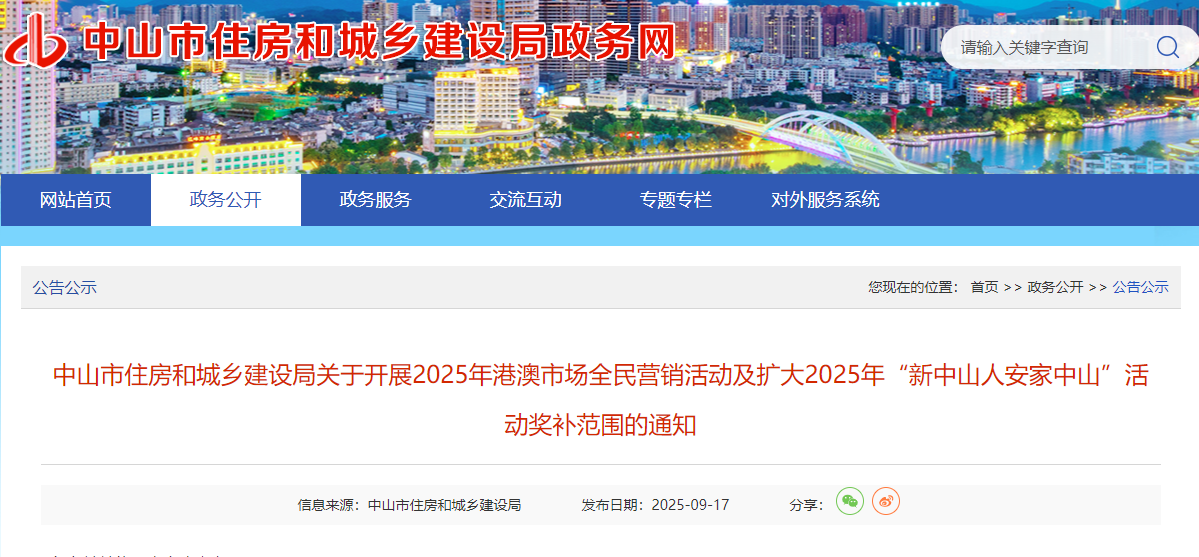 香港新聞網9月17日電 9月17日,廣東省中山市住房和城鄉建設局發布通知,決定開展2025年港澳市場全民營銷活動,並對“新中山人安家中山”活動擴大獎補範圍。