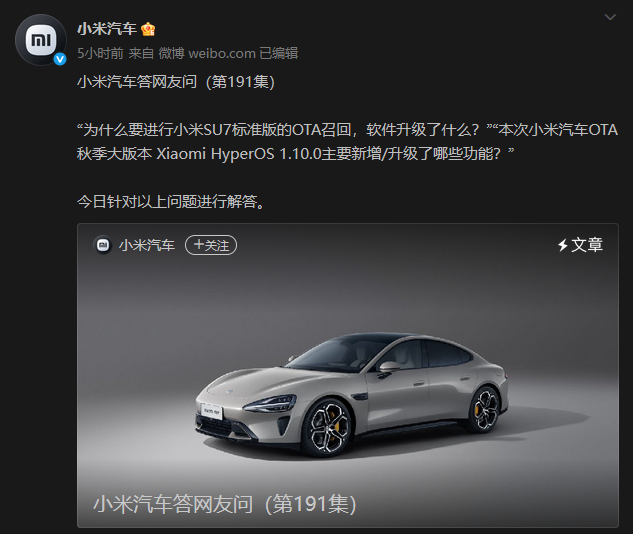 “小米汽車”微博賬號截圖 據悉,小米召回針對去年2月6日至今年8月30日生產的部分SU7標準版車型(不涉及其他版本),共計11.69萬輛。緣由為L2級高速領航輔助駕駛(NOA)功能在極端特殊場景下,識別、預警或處置可能不足,增加碰撞風險。公司將免費通過OTA技術升級車機至Xiaomi HyperOS 1.10.0版本,無需物理更換零件。 據小米官方解答顯示,本次升級重點優化輔助駕駛可靠性:包括速度控制策略調整、新增動態車速功能,提升高速通行連貫性。小米強調,用戶安全優先,此為行業常態召回,按程序備案。 同日,小米創始人雷軍轉發@小米汽車OTA秋季大版本升級公告稱,小米汽車OTA秋季大版本升級,即日起,小米SU7、YU7將同步升級。此次召回升級融入秋季推送,涵蓋輔助駕駛優化與智能座艙新特性,如任務管理、語音助手增強及寵物模式。 有業內人士分析指,此OTA方式有望快速化解隱患並提升用戶體驗。小米SU7銷量持續強勁,此舉或進一步鞏固品牌在智能電動車領域的競爭力。 小米汽車依據《缺陷汽車產品召回管理條例》,向中國國家市場監督管理總局備案召回計劃。(完) 【編輯:彭玉婷】