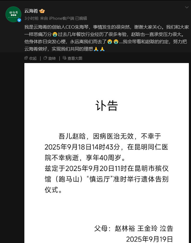 香港中通社9月19日電 中國知名連鎖餐飲品牌雲海肴聯合創始人、董事長趙晗突發心梗,經醫治無效,18日於雲南昆明同仁醫院病逝,年僅40歲。