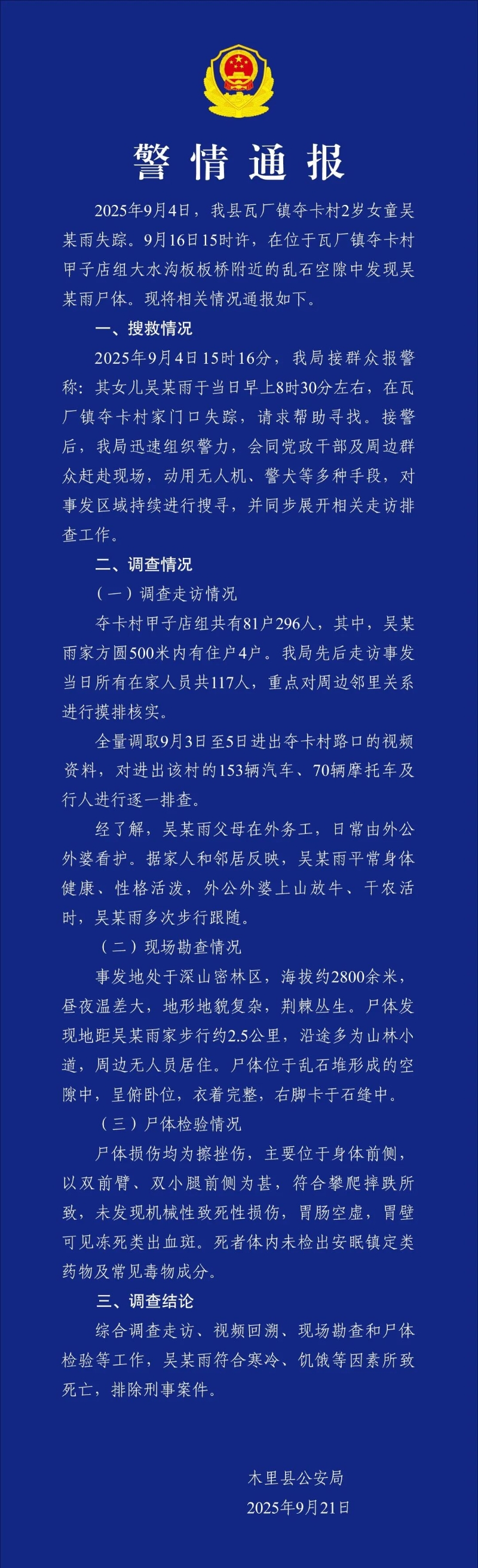 警情通報。圖源:“木里公安”微信公眾號 通報指,9月4日15時16分,木里縣公安局接民眾報警,稱其2歲女兒吳某雨當日早上8時30分左右在瓦廠鎮奪卡村家門口失蹤。接警後,警方迅速組織警力,聯合當地黨政幹部及群眾,動用無人機、警犬等手段展開搜救,並同步進行走訪排查。搜救行動持續至9月16日15時許,終於在奪卡村甲子店組大水溝板板橋附近的亂石空隙中發現吳某雨遺體,距其家約2.5公里。 調查顯示,吳某雨父母常年在外務工,女童由外公外婆照顧,平時身體健康、性格活潑,常隨外公外婆上山放牛或幹農活。警方走訪了事發地附近117名村民,重點排查鄰里關係,並調取9月3日至5日進出奪卡村的153輛汽車、70輛摩托車及行人視頻資料,逐一核查未發現異常。 事發地海拔約2800米,地處深山密林,地形複雜,荊棘叢生。女童遺體位於亂石堆空隙,呈俯臥位,衣著完整,右腳卡於石縫。屍檢結果顯示,女童身上擦挫傷主要分佈於前側雙前臂及雙小腿,符合攀爬摔跌所致,無機械性致命傷,胃腸空虛,胃壁有凍死類出血斑,未檢出安眠藥或毒物成分。 綜合走訪、視頻回溯、現場勘查及屍檢結果,警方認定吳某雨因寒冷、饑餓等因素死亡,排除刑事案件可能。(完) 【編輯:彭玉婷】