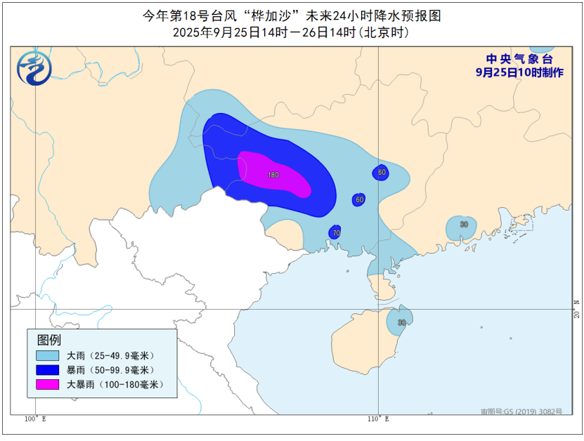 圖源:中央氣象台 25日,“樺加沙”造成的強風雨區域將轉移。南海北部、北部灣、廣東沿海及西南部地區、珠江口區、廣西沿海將有6至7級、陣風8至9級的大風,颱風中心經過的附近海域或地區風力可達8級、陣風9至10級。 廣西中南部、雲南東南部、貴州南部、廣東西部和北部、海南島東部等地部分地區有大到暴雨,其中,廣西西南部、雲南東南部等地部分地區有大暴雨。