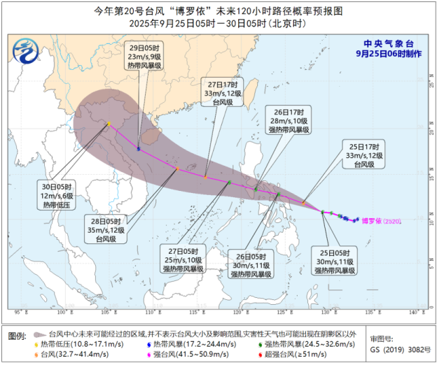 圖源:中央氣象台 另外,颱風“博羅依”27日淩晨將進入南海。今年第20號颱風“博羅依”已於24日夜間加強為強熱帶風暴級,其中心25日早晨5點鐘位於菲律賓馬尼拉東偏南方向約990公里的西北太平洋洋面上,11級(30米/秒)。 預計,“博羅依”將以每小時20至25公里的速度向西偏北方向移動,穿過菲律賓中部後,於27日淩晨進入南海東部海域,之後向西北方向移動,強度逐漸增強。(完) 【編輯:彭玉婷】