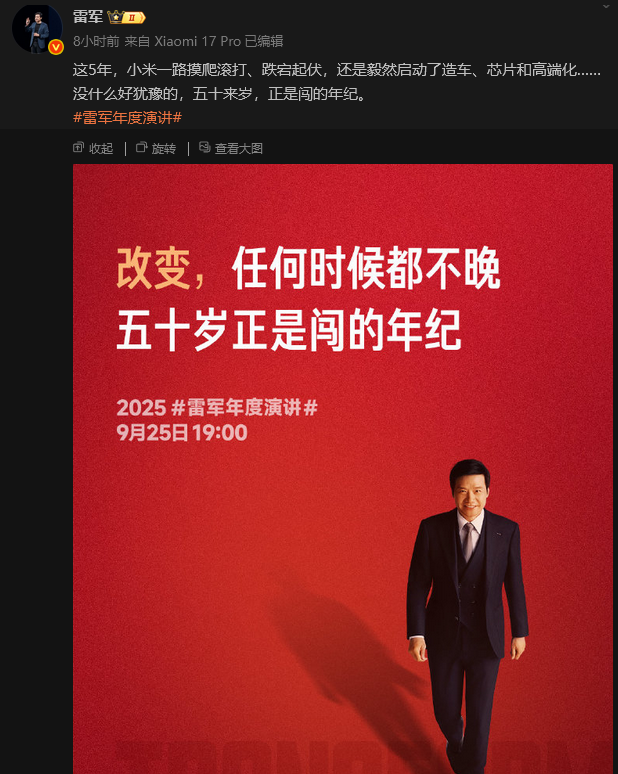 圖源:雷軍微博賬號截圖 綜合報道,雷軍表示,盡管經歷“摸爬滾打、跌宕起伏”,小米仍毅然啟動了造車、重啟芯片研發,並持續推進高端化戰略。他強調,面對挑戰毫不退縮。 雷軍此前坦言,造車與重啟造芯是小米近五年最關鍵的兩大決策,且幾乎同時推進,將公司前十年積累的“家底全押上了”。他以“同時供家裡兩個孩子上大學”比喻當前壓力之巨,直言“說實話,壓力巨大”,並感慨當初做出這一決定所需的勇氣。 備受關注的雷軍年度演講將於北京時間9月25日晚7點舉行,主題為《改變》,這是他第六次年度演講。屆時,他將首次系統揭秘小米自研“玄戒”芯片與小米汽車項目背後的研發故事與戰略考量。 有評論指,此次年度演講被視為小米全面展示技術積累與未來方向的關鍵窗口,市場高度期待其在智能汽車與半導體領域的突破進展。(完) 【編輯:彭玉婷】