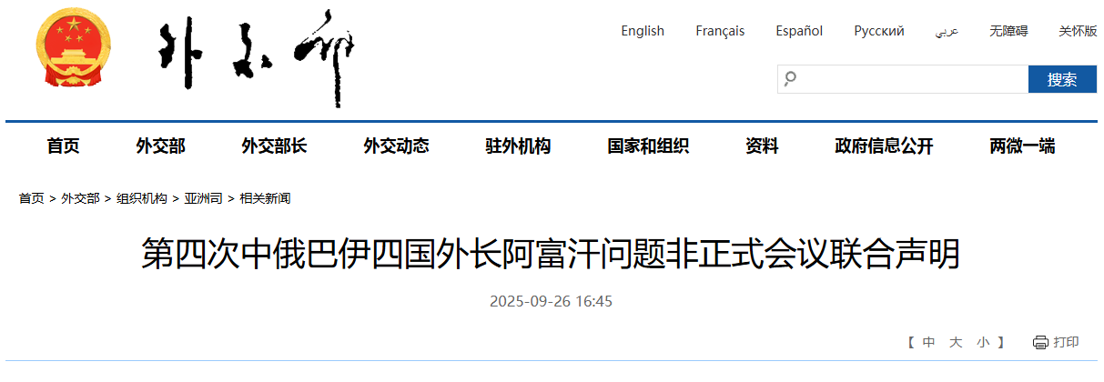 香港中通社9月26日電 中國外交部發言人郭嘉昆26日在例行記者會介紹,中國、俄羅斯、巴基斯坦、伊朗四國外長阿富汗問題非正式會議25日在紐約第80屆聯合國大會期間舉行。會議發表《聯合聲明》,強調尊重阿富汗的主權、獨立和領土完整。