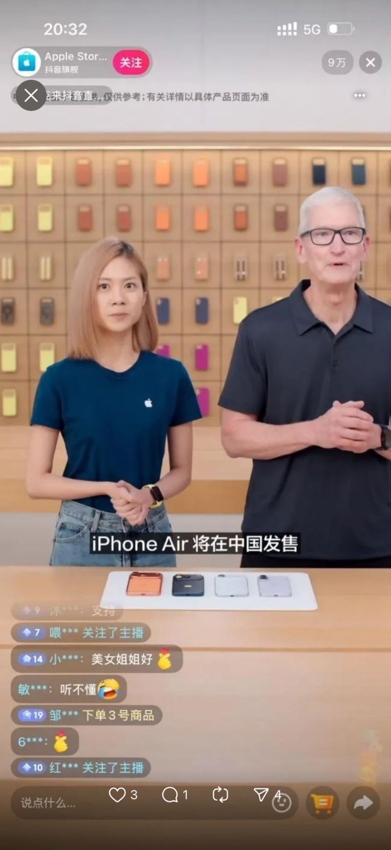 香港新聞網10月14日電 蘋果公司行政總裁蒂姆·庫克(Tim Cook)近日展開訪華行程,以兩大亮點搶佔輿論焦點:不僅首度於抖音平台直播帶貨,宣布iPhone Air下周起中國發售;更現身上海藝術展,與本土潮流文化代表互動,展現對中國市場的深度關注。 庫克親自“帶貨” iPhone Air成焦點 13日晚,Apple Store旗艦店於抖音開啟直播,庫克意外現身與網友互動,完成其個人直播帶貨“處子秀”。“庫克來抖音直播了”迅速登頂中國社交平台熱搜,引發百萬網友圍觀。 直播中,庫克親自演示即將發售的iPhone Air,輕盈機身引發讚嘆:“它非常輕,好像能飛走!”他同時宣布,iPhone Air將於10月17日開啟預訂,下周正式於中國市場發售。這一消息立即點燃消費者熱情,相關話題在電商平台及社交媒體持續發酵。