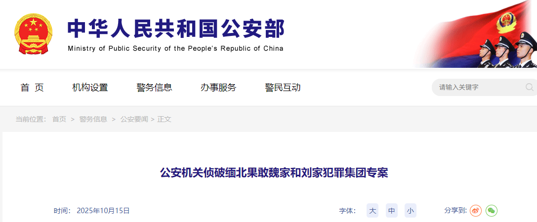 圖源:中國公安部官網截圖 據介紹,2023年8月,中國公安部部署福建泉州、龍岩公安機關分別對緬北果敢魏家、劉家犯罪集團開展專案偵辦。2023年10月1日,中國公安機關在雲南邊境抓獲魏家犯罪集團魏青濤、劉家犯罪集團劉正琦等9名重要犯罪嫌疑人。同年12月,在掌握魏家、劉家犯罪集團大量違法犯罪事實和證據的基礎上,中國公安機關依法對魏懷仁、劉正祥等人公開懸賞通緝。2024年1月30日,依託中緬執法安全合作機制,緬甸警方將前期已抓獲的魏懷仁、劉正祥、劉正茂等重要犯罪嫌疑人移交中方。
