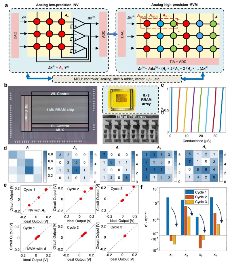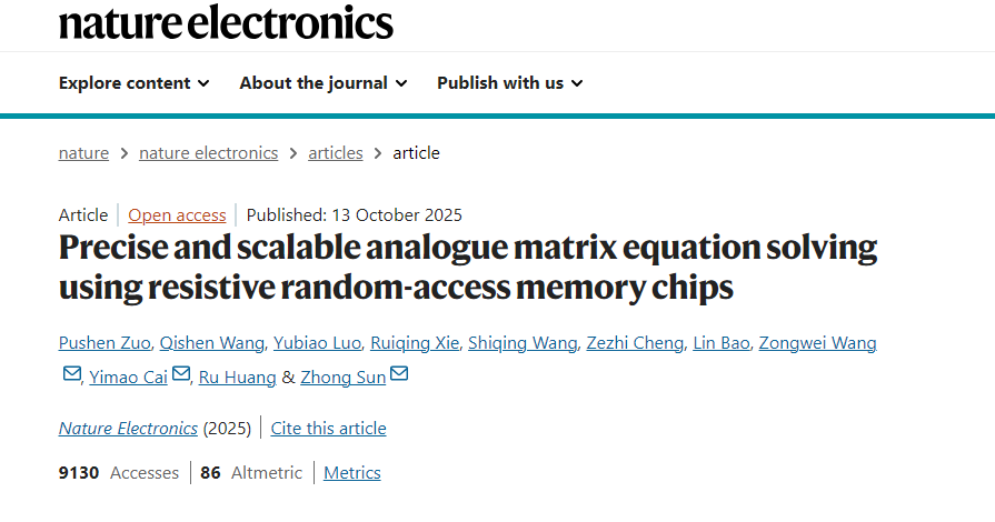 圖為高精度全模擬矩陣計算求解矩陣方程 圖源:北京大學官網 據人民日報微信公號23日消息,該芯片將傳統模擬計算的精度提升了驚人的五個數量級。相關性能評估表明,該芯片在求解大規模MIMO信號檢測等關鍵科學問題時,計算吞吐量與能效較當前頂級數字處理器(GPU)提升百倍至千倍。這一成果標誌著中國突破模擬計算世紀難題,在後摩爾時代計算範式變革中取得重大突破,為應對人工智能與6G通信等領域的算力挑戰開闢了全新路徑。 相關論文於10月13日刊發於《自然·電子學》期刊。