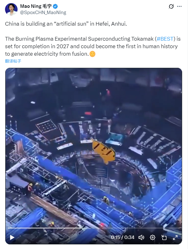 中國外交部發言人毛寧近日在社交平台向世界分享中國“人造太陽”。圖源:社交平台“X”截圖 據公開資料,本月初,中國核聚變裝置BEST項目建設取得關鍵突破,裝置主機的關鍵部件——杜瓦底座研制成功並順利完成交付。 今年5月,BEST總裝工作正式啟動,預計兩年後建成。 核聚變被視為“終極能源”,其原料氘可從海水中提取,近乎無限。一杯海水通過核聚變反應產生的能量相當於300升汽油,且無放射性污染,可以降低能源成本,優化能源結構。 除了緊湊型聚變能實驗裝置(BEST),合肥還坐落著全超導托卡馬克核聚變實驗裝置(EAST)、聚變堆主機關鍵系統綜合研究設施(CRAFT),共同構建出中國“可控核聚變天團”。從EAST點火,到BEST演示發電,再到CRAFT造部件,中國科學家力爭在未來二、三十年內讓聚變發電真正走進千家萬戶。(完) 【編輯:彭玉婷】
