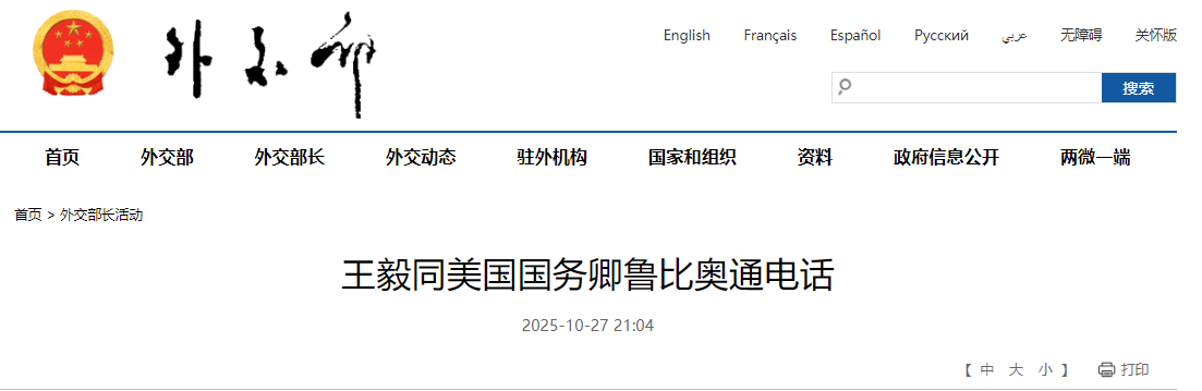 圖源:中國外交部網站截圖 據中國外交部消息,王毅表示,中美關係牽動世界的走向,一個健康、穩定、可持續的雙邊關係符合兩國長遠利益,也是國際社會共同期待。中國國家主席習近平和美國總統特朗普都是世界級領袖,長期交往、彼此尊重,這已成為中美關係最寶貴的戰略資產。前段時間,中美經貿關係再次出現波折。通過吉隆坡經貿會談,雙方澄清了立場,增進了理解,就對等解決當前緊迫的經貿問題達成框架共識。這再次證明,只要雙方不折不扣落實兩國元首達成的重要共識,秉承平等、尊重、互惠精神,堅持通過對話化解矛盾,摒棄動輒施壓的做法,就有可能推動兩國關係穩下來、向前走。希望雙方相向而行,為中美高層互動做好準備,為兩國關係發展創造條件。 魯比奧表示,美中關係是世界上最重要的雙邊關係,期待通過高層互動,向世界發出積極信號。 10月25日至26日,中美經貿中方牽頭人、國務院副總理何立峰與美方牽頭人、美國財政部長貝森特和貿易代表格里爾在吉隆坡舉行中美經貿磋商。據路透社報道,就此次磋商成果,美國財長貝森特26日說,中美官員在談判中制定了“非常成功的框架”,“我認為這個框架具有建設性,而且影響深遠,使我們能够繼續推進,為兩國領導人根據非常成功的框架舉行會晤奠定基礎”。 26日,美國總統特朗普在吉隆坡參加東盟峰會期間對媒體表示,他有信心能與中方達成“一項非常全面的協議”。(完) 【編輯:彭玉婷】