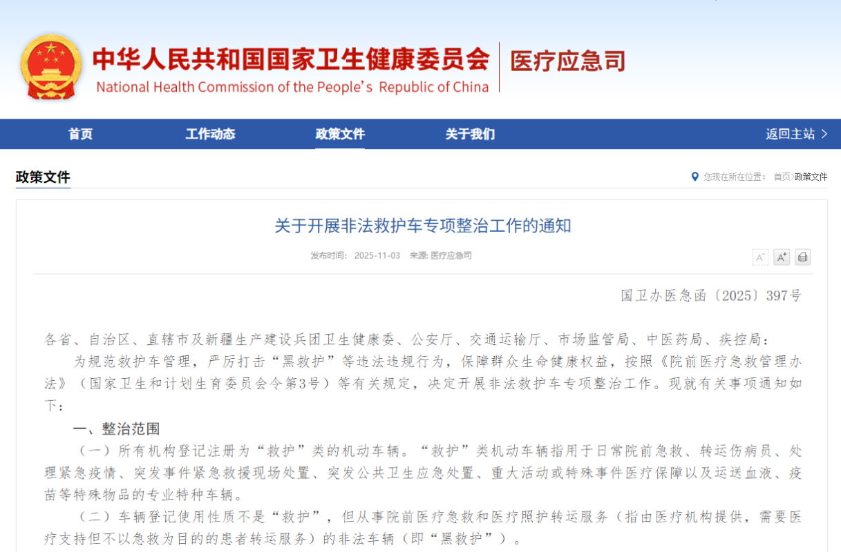 圖源:中國國家衛健委網站截圖 據中國國家衛生健康委員會網站11月3日消息,中國國家衛生健康委辦公廳等近日印發了《關於開展非法救護車專項整治工作的通知》(以下簡稱《通知》),明確本次專項整治面向登記注册為“救護”類的機動車輛,以及非法提供院前醫療急救和醫療照護轉運服務的非“救護”類車輛(即“黑救護”)。 本次專項整治工作重點任務包括三個方面。一是明確了衛生健康行政部門要聯合公安交管部門對救護車進行全面清查,摸清底數,并實時核查比對救護車輛的新增、注銷情況。二是明確了救護車的管理主體和監管原則,強調了救護車規劃、信息化賦能和社會協同監管。三是明確了登記注册為“救護”類的機動車輛、“黑救護”違規違法行為打擊範圍,對涉事機構及人員依法依規嚴肅處理。四是鼓勵、支持社會力量參與醫療照護轉運,有序化解供需矛盾,疏堵結合引導醫療照護轉運服務良性發展。(完) 【編輯:彭玉婷】