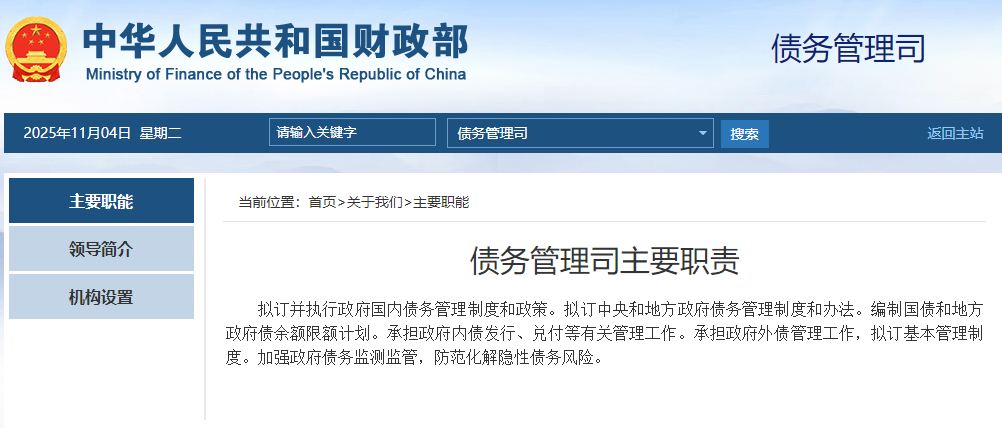 圖源:中國財政部官網截圖 據財政部官網介紹,債務管理司主要職責包括:擬訂並執行政府國內債務管理制度和政策。擬訂中央和地方政府債務管理制度和辦法。編制國債和地方政府債餘額限額計劃。承擔政府內債發行、兌付等有關管理工作。承擔政府外債管理工作,擬訂基本管理制度。加強政府債務監測監管,防範化解隱性債務風險。 財政部債務管理司司長李大偉,副司長曲富國、趙則永。該司下設六個處:綜合處、中央債務處、地方債務一處、地方債務二處、發行兌付處、監測管理處。 李大偉在10月18日發布會上表示,將提前下達明年新增地方政府債務限額,重點支持國家重大戰略項目,並用於化解存量隱性債務及清償政府拖欠企業賬款,保障地方財政平穩運行。 財政部長藍佛安近期亦多次強調加強債務管理的重要性。他在《“十五五”規劃建議輔導讀本》中指出,未來將全面落實一攬子化債方案,推進存量隱性債務置換,建立統一的長效監管機制,嚴查違規舉債和虛假化債行為,防止“前清後欠”。 同時,加快地方融資平台改革轉型,嚴禁新設或變相設立融資平台,優化債務結構,構建與高質量發展相適應的政府債務管理體系。藍佛安強調,“十五五”期間要統籌發展與安全,做到“在發展中化債、在化債中發展”,為經濟行穩致遠提供支撐。(完) 【編輯:彭玉婷】