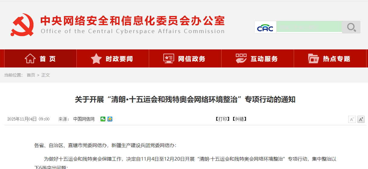 圖源:中國中央網信辦官網截圖 據通知,專項行動首要聚焦虛假信息治理,嚴厲打擊散布涉賽事及相關地區公共政策、社會民生領域的謠言,特別是涉及災難事故、違法犯罪、食品安全、疫情防控等內容,尤其對權威闢謠後仍惡意傳謠的行為予以重點處置。 其次,整治歪曲傳播突發事件信息的行為,嚴禁假冒當事人身份發聲或借機翻炒舊聞舊事,防止誤導公眾、擾亂秩序。 第三,遏制破壞社會穩定的信息傳播,包括抹黑“一國兩制”制度、散布民族或地域歧視言論、煽動群體對立等行為,嚴防惡意損害香港、澳門、廣州、深圳等主要舉辦地形象。 第四,規範互聯網新聞信息服務,嚴禁未經許可擅自發布涉賽事新聞,並重點打擊利用人工智能技術生成虛假賽事視頻及關聯人員不實信息。 第五,嚴查網絡假冒仿冒行為,包括使用相似名稱、域名、標識等仿冒賽事官網、App、小程序,以及在社交賬號、直播間背景中冒充官方機構或媒體。 第六,全面遏制網絡暴力與飯圈亂象,嚴禁組織“人肉搜索”、洩露運動員及工作人員隱私,杜絕拉踩引戰、互撕謾罵等干擾備戰與賽事的行為。 第十五屆全國運動會(十五運會)將於11月9日至21日舉行,全國第十二屆殘疾人運動會暨第九屆特殊奧林匹克運動會(殘特奧會)將於12月8日至15日舉行,均由粵港澳三地首次聯合承辦。(完) 【編輯:彭玉婷】