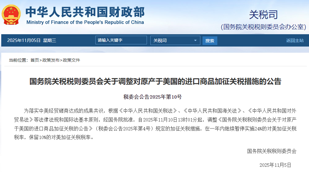 圖源:中國財政部官網截圖 為落實中美經貿磋商達成的成果共識,根據《中華人民共和國關稅法》、《中華人民共和國海關法》、《中華人民共和國對外貿易法》等法律法規和國際法基本原則,經國務院批准,國務院關稅稅則委員會公布公告,自2025年11月10日13時01分起,調整《國務院關稅稅則委員會關於對原產於美國的進口商品加徵關稅的公告》(稅委會公告2025年第4號)規定的加徵關稅措施,在一年內繼續暫停實施24%的對美加徵關稅稅率,保留10%的對美加徵關稅稅率。 本次中美繼續暫停實施部分雙邊加徵關稅,有利於推動中美經貿關係健康、穩定、可持續發展,造福兩國人民,促進世界繁榮。(完) 【編輯:彭玉婷】
