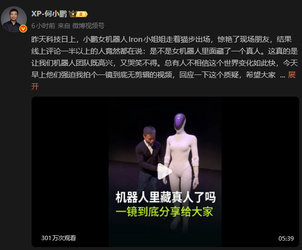 中國人形機器人IRON引“藏真人”質疑 何小鵬回應分享到:
