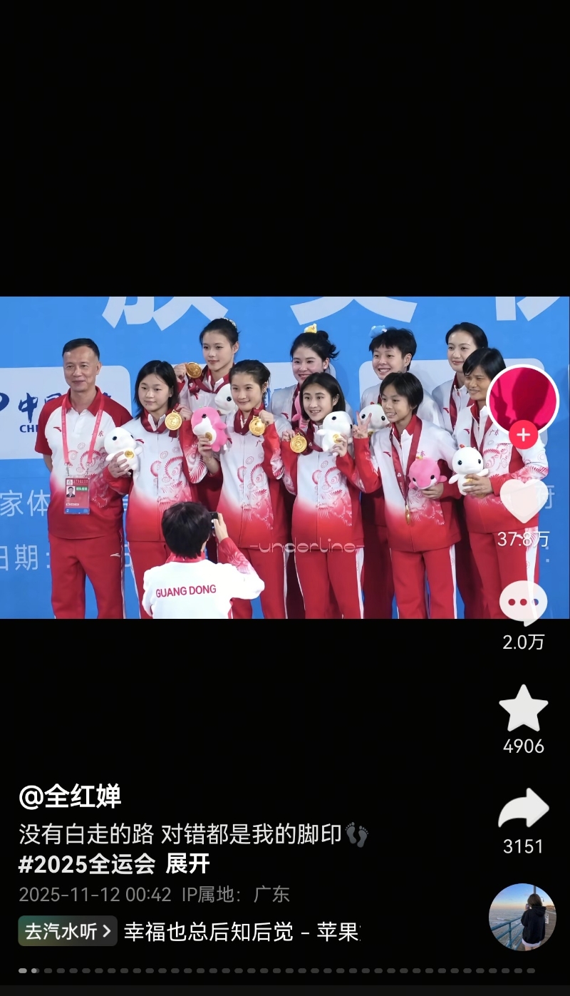 香港新聞網11月12日電 11月12日凌晨,在第十五屆全運會跳水比賽收官後,兩屆奧運冠軍、廣東隊選手全紅嬋在社媒曬出多張全運會現場照片及頒獎花絮,並配文寫道:“沒有白走的路,對錯都是我的腳印。” 評論區滿滿都是祝福,不少網友留言“你是最棒的”,“一步一個腳印”。
