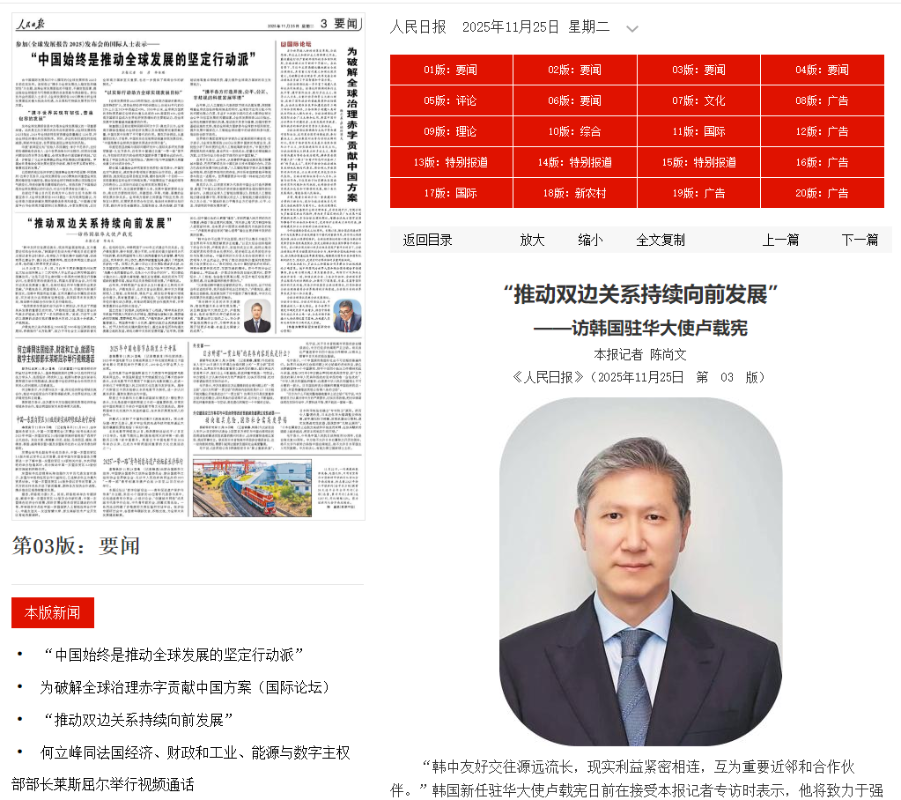 圖源:人民日報官網截圖 綜合媒體26日報道,25日刊出的專訪中,盧載憲表示韓中友好交往源遠流長,現實利益緊密相連,互為“搬不走的重要近鄰”和“分不開的合作夥伴”。他高度評價11月1日在韓國慶州舉行的韓中元首會談,指出雙方同意深挖人工智能、生物製藥、綠色產業及銀髮經濟等新興領域合作潛力,對推動雙邊戰略合作夥伴關係行穩致遠具有重要意義。 盧載憲表示,中國國家主席習近平對韓國進行國事訪問,是時隔11年再度訪韓,也是韓國總統李在明就任後兩國元首首次會晤。會談氣氛友好坦誠,成果豐碩。 作為前總統盧泰愚之子,盧載憲回顧了1992年韓中建交的歷史意義,稱兩國在制度理念不同的背景下仍能突破障礙建交,體現了非凡智慧與遠見。他呼籲堅守建交初心,繼承先輩精神,增進互信,推動關係持續向前。 盧載憲還強調“國之交在於民相親”,特別重視青年交流。他舉例稱,旅韓大熊貓“福寶”深受兩國人民喜愛,“周末遊上海”成為韓國年輕人新潮流,簽證便利化正促進民間往來升溫。 談及區域合作,盧載憲表示韓中可在亞太經合組織框架下加強協作,支持中國明年在深圳主辦APEC會議,共同推進貿易投資自由化、數字經濟與包容性發展。 另據韓聯社報道,《人民日報》時隔6年多再次刊發韓國駐華大使專訪稿,而且規格有所升級。分析認為,這可能與李在明政府成立以來韓中關係改善勢頭更加明顯有關,也反映了各方對盧載憲個人的期待。(完) 【編輯:彭玉婷】