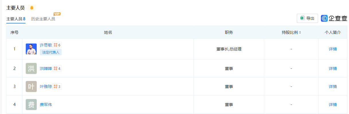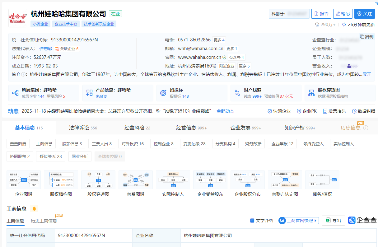 圖源:企查查網站截圖 娃哈哈是中國飲料龍頭企業,由宗慶後創辦。2021年,宗慶後之女宗馥莉出任娃哈哈集團副董事長兼總經理,負責日常工作。企查查股權穿透顯示,目前宗馥莉仍持有杭州娃哈哈集團29.4%的股權。 據媒體今年10月報道,宗馥莉已於9月12日向娃哈哈集團正式提交辭職申請,辭去公司法定代表人、董事及董事長等核心職務,且該辭職事項已通過集團股東會與董事會的相關審議程序,完成內部任免流程。 據泰山財經,許思敏1994年出生,畢業於浙江大學法學專業,2015年曾創辦中西快餐品牌“原牛道”並擔任法人,創業遇挫後入職宏勝集團法務部,處理過娃哈哈與達能的商標權糾紛等多個案件,後從法務專員升任為法務部部長。 宗馥莉2024年接班娃哈哈集團後,許思敏被提拔進入權力核心,曾擔任娃哈哈集團監事,並任多家關聯公司法定代表人、總經理。今年10月,宗馥莉辭去娃哈哈集團董事長後,許思敏被任命為集團總經理。(完) 【編輯:彭玉婷】