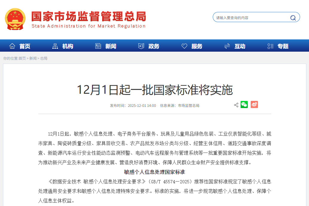 圖源:中國國家市場監管總局網站截圖 其中,《數據安全技術 敏感個人信息處理安全要求》推薦性國家標準規定了敏感個人信息處理通用安全要求和敏感個人信息處理特殊安全要求。中國國家市場監管總局當天表示,該標準的實施,將進一步規範敏感個人信息處理、保障個人信息主體權益。 《電子商務平台服務質量評價》推薦性國家標準提出了電子商務平台服務質量評價指標體系,規定了評價指標的取值規則和賦值依據、評價原則與方法、評價結果形成規則及擴展原則。中國國家市場監管總局當天表示,該標準的實施,有利於提升電子商務平台服務質量,優化電子商務平台用戶體驗,提高電子商務平台監管質量。 此外,涉玩具及兒童用品綠色包裝、工業儀表智能化等級、城市家具、陶瓷磚質量分級、家具回收交易、農產品批發市場分類與分級、經營主體信用、道路交通事故深度調查、新能源汽車運行安全性能動態監測預警、電動汽車遠程服務與管理系統等國家標準也從12月1日起開始實施。(完) 【編輯:彭玉婷】
