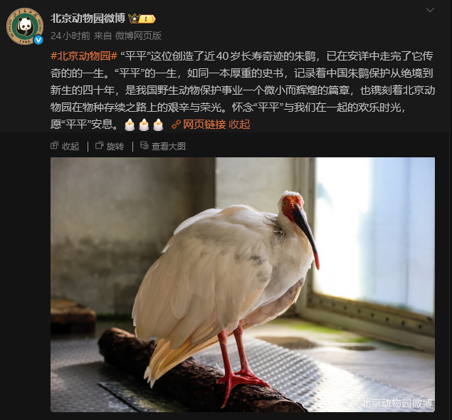 北京動物園人工飼養最長壽朱䴉去世分享到:
