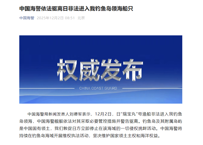 香港新聞網12月2日電 中國海警局2日消息,中國海警局新聞發言人劉德軍表示,12月2日,日“瑞寶丸”號漁船非法進入中國釣魚島領海,中國海警艦艇依法對其採取必要管控措施並警告驅離。