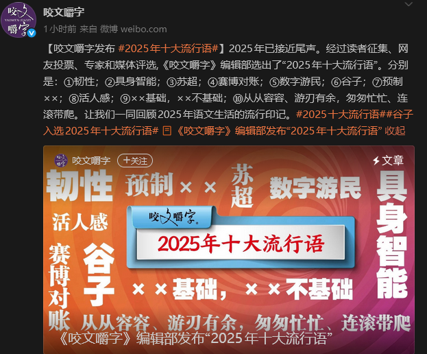 圖源:“咬文嚼字”微博賬戶截圖 其他入選流行語包括:“具身智能”、“蘇超”、“賽博對賬”、“數字遊民”、“谷子”、“預製××”、“活人感”、“××基礎,××不基礎”以及網絡熱句“從從容容、游刃有餘,匆匆忙忙、連滾帶爬”。 主編黃安靖表示,評選繼續堅持語言的“社會學價值”與“語言學價值”雙重標準,反映年度重大議題與民眾真實生活。 據介紹,“韌性”高居榜首,凸顯社會在多重挑戰下展現出的恢復力與抗壓能力;“蘇超”、“賽博對賬”等詞因緊扣年度熱點事件而廣受關注。編輯部指出,2025年流行語呈現三大鮮明特徵。 首先,智能時代深刻重塑語言體系。榜單中的“具身智能”、“活人感”等詞,體現人工智能技術已從專業領域滲透至日常表達。諸如“智能體”、“數字人”及各類“智能+”詞匯的湧現,標誌著AI不僅改變生活方式,也在重構漢語結構。 其次,新質生產力推動新經濟語匯誕生。“谷子”(源自“goods”,指二次元衍生商品)、“數字遊民”等入選,反映就業形態與消費模式的多元轉型。備選詞如“竪店”、“低空經濟”、“悅己經濟”等,亦印證語言對產業升級的敏銳捕捉。 第三,流行語成為社會情緒的晴雨表。“從從容容、游刃有餘,匆匆忙忙、連滾帶爬”以對比句式道出當代人的生存狀態;“預製××”、“××基礎,××不基礎”等則折射對標準化生活與個體差異的反思。 《咬文嚼字》創刊於1995年,是由上海世紀出版集團主管、上海咬文嚼字文化傳播有限公司主辦,針對社會語文運用的期刊。(完) 【編輯:彭玉婷】