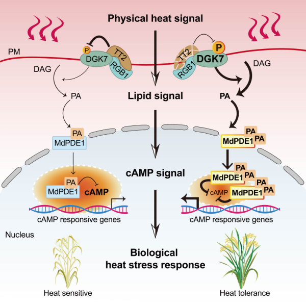 熱信號轉換的分步解碼機制模型 圖源:中國科學院分子植物科學卓越創新中心 隨著全球氣候變暖加劇,持續的高溫直接威脅著全球糧食安全的根基。高溫會損害作物花粉活力、阻礙授粉與灌漿過程,明顯降低產量和品質,直接削弱主糧產區的生產潛能,已成為當下最嚴峻、最直接的糧食安全挑戰之一。 研究團隊經過多年努力,成功鑒定到水稻中兩個關鍵調控因子,DGK7(二醯甘油激酶)和MdPDE1(磷酸二酯酶)。它們像一套精密協作的“警報系統”,將高溫物理信號一步步轉化為細胞能够理解的“生物指令”,完成一場從細胞邊界到細胞核的“傳訊”。該發現系統連接了從細胞膜脂質重塑到核內信號級聯的完整過程,解決了領域內長期存在的難題。 該機制的破解為育種提供了精準靶點。在高溫下,單基因改良的株系比對照增產50%~60%;雙基因改良的株系比對照增產提高約一倍,且不影響正常條件下的產量。科學家不僅能改良作物的耐熱性,更能像調節音量一樣精準設計“梯度耐熱”品種,以適應不同地區的氣候需求,為其他主糧作物的耐熱育種改良提供扎實的理論依據與寶貴的基因資源。(完) 【編輯:彭玉婷】