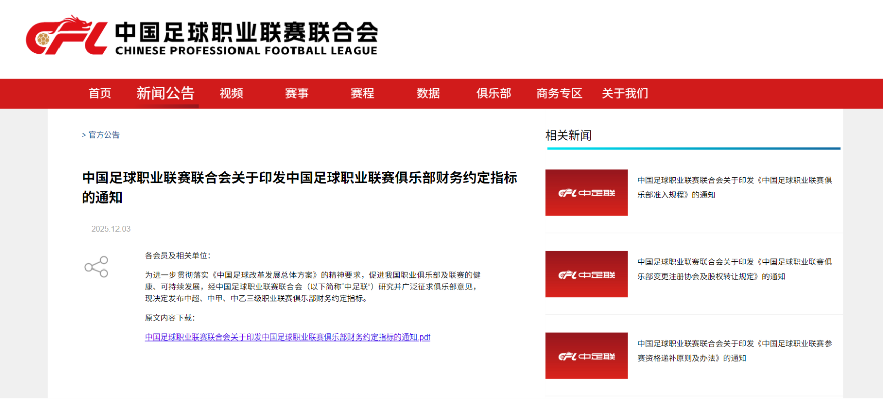 中足聯官網截圖 就俱樂部單個財年總支出,《指標》規定,以稅前計,中超(中國足球超級聯賽)俱樂部單個財年總支出不得超過6億元人民幣,中甲(中國足球甲級聯賽)俱樂部不得超過2億元人民幣,中乙(中國足球乙級聯賽)俱樂部不得超過5千萬元人民幣。